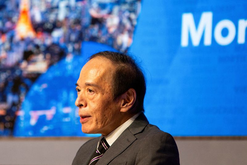 日銀の植田和男総裁は9日、スイスのバーゼルで国際決済銀行(BIS)などが主催した気候変動関連の会合に出席し、気候変動が将来の物価動向に長期的なショックを与えるとしても、日銀は2%のインフレ目標を維持したいと述べた。写真は10月、ワシントンで撮影(2024年 ロイター/Kaylee Greenlee Beal)