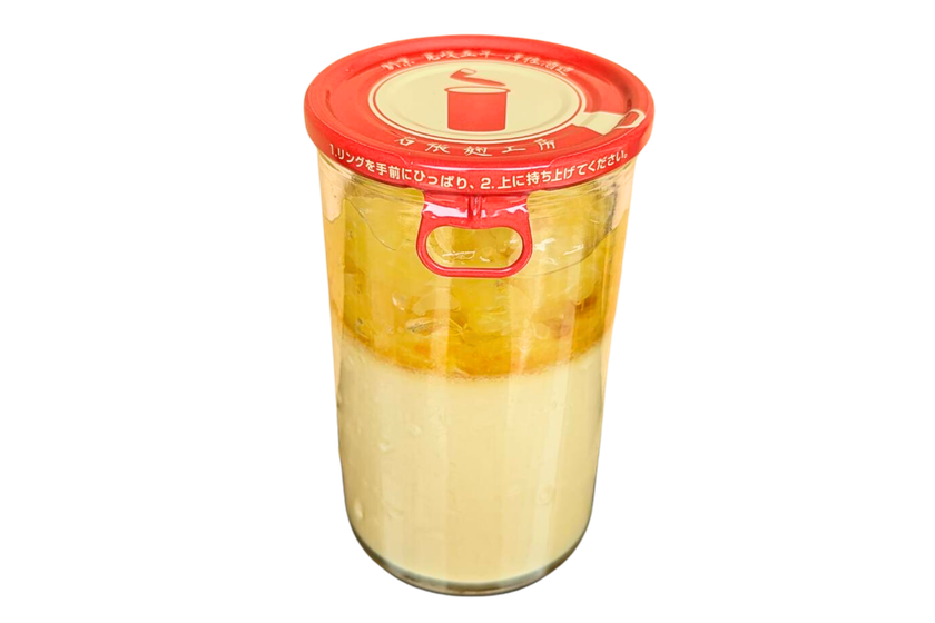 麹甘酒プリンに、カットした生の甘夏みかんがたっぷりはいったゼリーをトッピングしています。甘夏みかんゼリーの酸味と甘さが、やわらかな甘さの麹甘酒プリンに爽やかな味わいをプラスしてくれます。