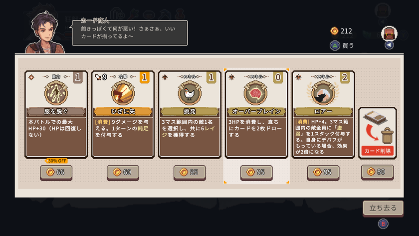 冒険の途中で、プレイヤーを助けてくれる様々なNPCに出会うことができます。その中には、一度無料でカードの能力をアップグレードしてくれる者や、アイテムやカードを販売している者もいます。しかし、商人などのNPCは、物品を購入しない限り、価格が上がることに注意してください!アイテムや秘宝を購入したい場合は、お金をしっかり用意してから店を訪れるのがベストです。