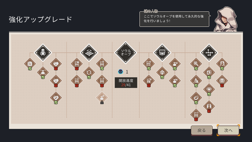 どんなに頭をひねっても、運が悪い時は敗北の運命から逃れられません。失敗に直面するのはとても落ち込むことかもしれませんが、冒険ごとに一定数量のソウルオーブを得ることができます。ソウルオーブは次の冒険の前にさまざまなアップグレードに使用でき、各職業の体力上限を上げることができるほか、ゲーム内での選択肢を追加することで、キャンプファイアでのHP回復量を増やすなど、勝利の機会を高めることができます!