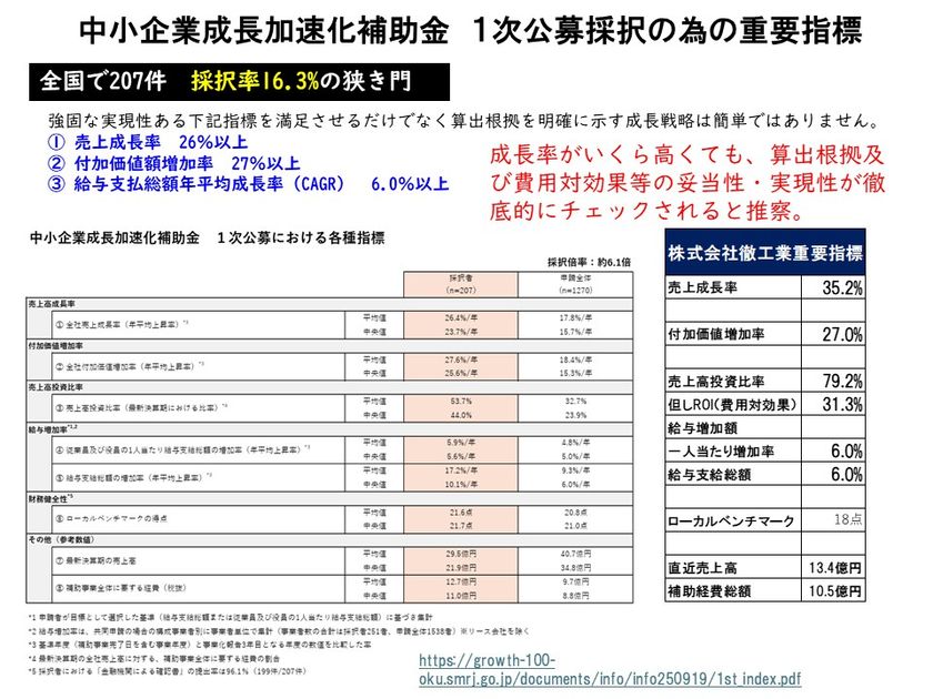その第2次審査へ進める企業も20%以下(当社推定)であり、大規模設備投資による費用対効果は妥当か、労働生産性年平均成長率等が賃上げの為に充分かだけでなく算出根拠及び整合性が厳しくチェックされます。下記は事務局から公表の重要指標ですが、当社支援企業は採択企業平均値以上でした。