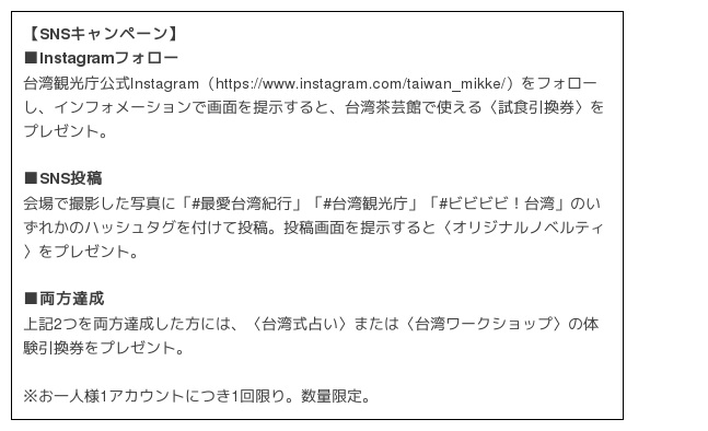 本イベントでは、台湾茶の試飲、占い体験、台湾夜市風のゲーム、台湾グルメをモチーフにしたキーホルダー作りなど、各自の偏愛を見つけよう、台湾の"偏愛ポイント"を詰め込んだ多彩なプログラムをご用意しました。公式SNSフォローで体験できる試食試飲コーナーや台湾観光情報コーナーもあり、帰宅後も誰かと台湾旅行について語りたくなる、シェアしたくなる特別な体験をお楽しみ頂けます。