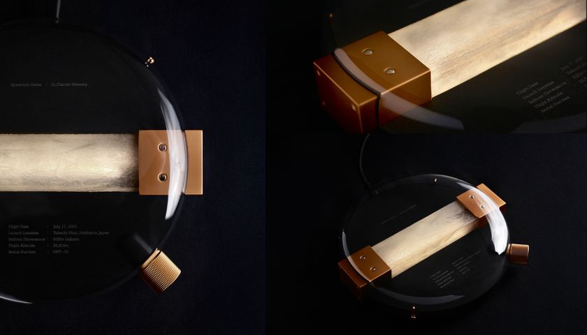 《O3 Cosmic Memory》は、静かに輝く光の彫刻であり、実際に成層圏に到達した株式会社岩谷技研のガス気球膜素材を用いて制作された。
