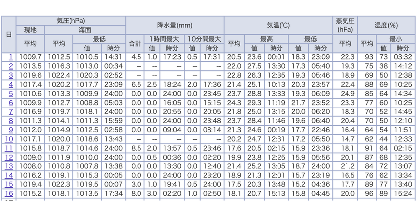 ▼出典:東京(東京都) 2025年10月(日ごとの値) 詳細(気圧・降水量・気温・蒸気圧・湿度)/気象庁