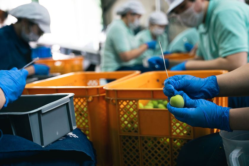 ■「浦霞の梅酒」の梅は地元・宮城にこだわる。2.6tの梅のヘタを手作業で取る