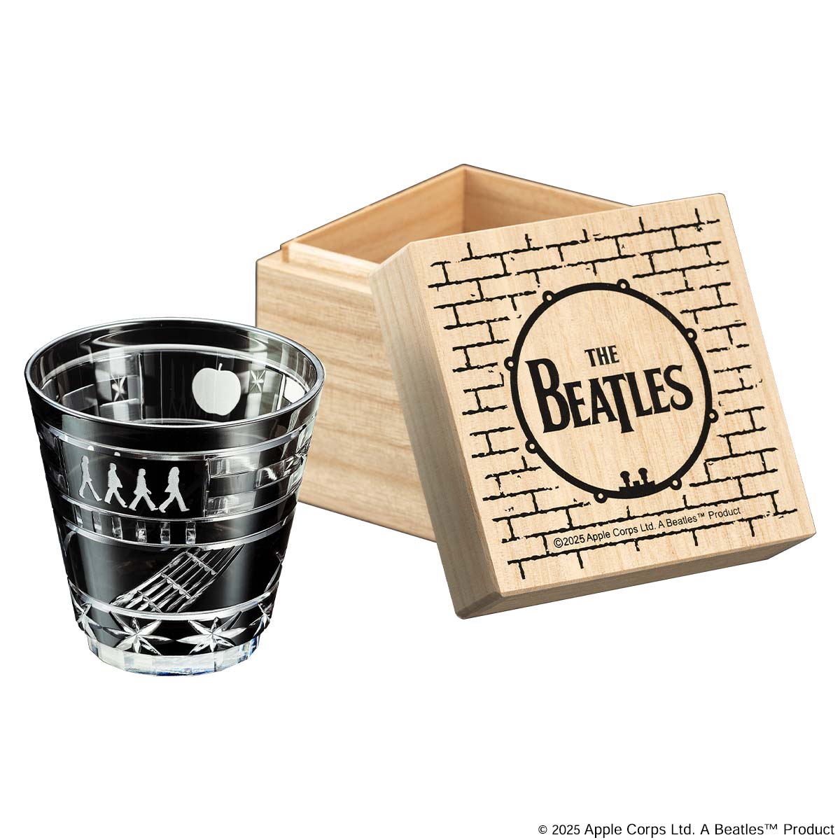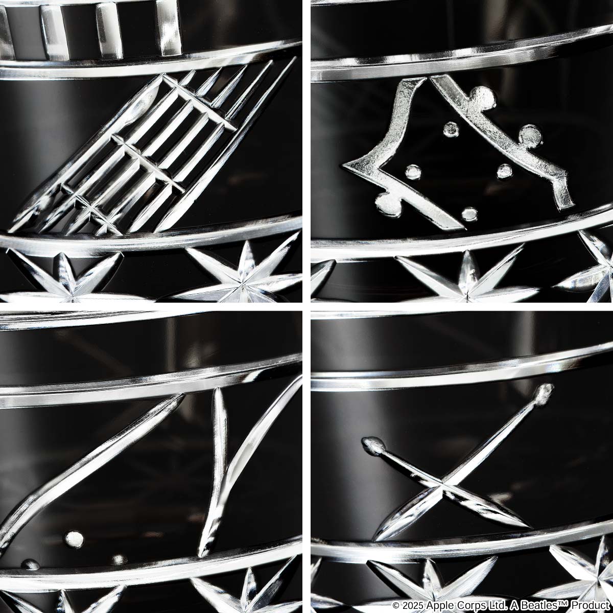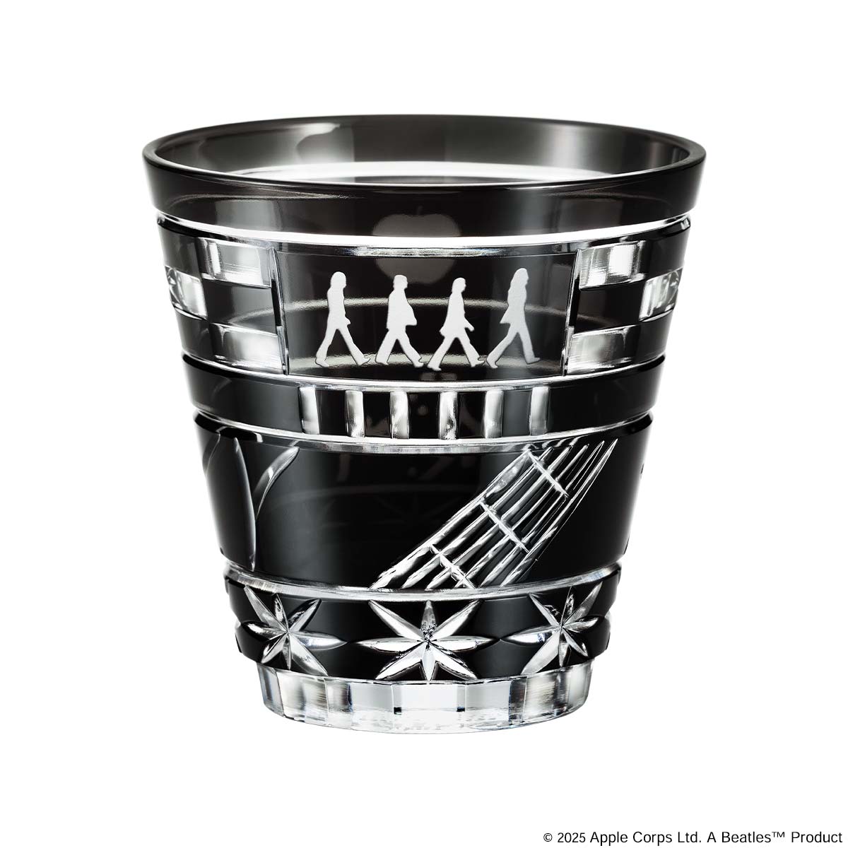漆黒の色被せガラスに、アビイ・ロードの横断歩道を渡るメンバーのシルエットや楽器のモチーフ、英国のレンガの街並みをイメージした市松模様などが、伝統技法を用いて表現されています。
