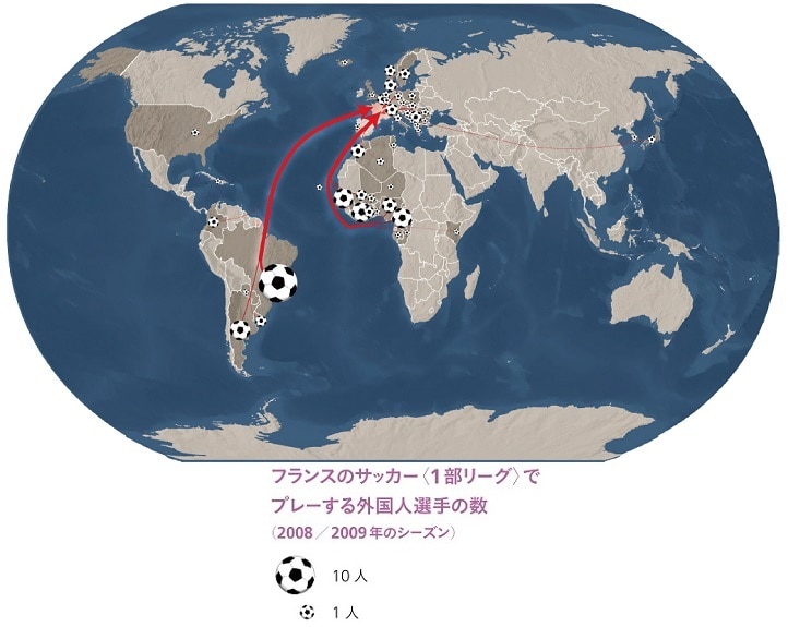 北(半球)の国々のサッカー・クラブでプレーをするために、南(半球)の国々から来るサッカー選手がますます増えている。そういう選手たちは先進国で養成されたチームメイトより年俸が低い。このことは、国際的な人材補給が行なわれる理由を一部説明してくれる。フランスの場合、かつて植民地が多くあった西アフリカからの選手が多い。