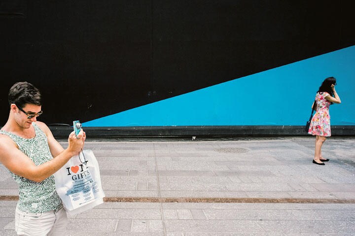 ニューヨークの街中にあふれる広告の看板や標識、通りの壁に描かれたデザインや落書き。そして、そこを行き交うビジネスマンや家路を急ぐ女性――。同じ空間に存在する「静と動」が交差する瞬間に、偶然の構図が生み出され、非現実的な世界がつくられる。