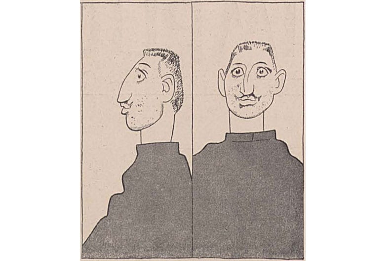 (上図:「我々の犯罪者名簿より」〔ドイツ〕。「暗殺犯」プリンツィプ。作者グルブランソン〔ノルウェー生まれ〕は、当時のドイツを代表する諷刺画家。『ジンプリツィシムス』誌で活躍。同誌はイギリスの『パンチ』と並び称されるドイツの諷刺雑誌。)――『第一次世界大戦史――諷刺画とともに見る指導者たち』より