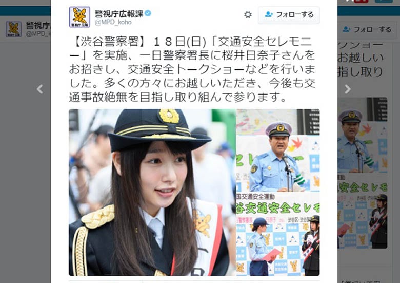 【渋谷警察署】18日(日)「交通安全セレモニー」を実施、一日警察署長に桜井日奈子さんをお招きし、交通安全トークショーなどを行いました。多くの方々にお越しいただき、今後も交通事故絶無を目指し取り組んで参ります。 pic.twitter.com/34Bzco4MBN