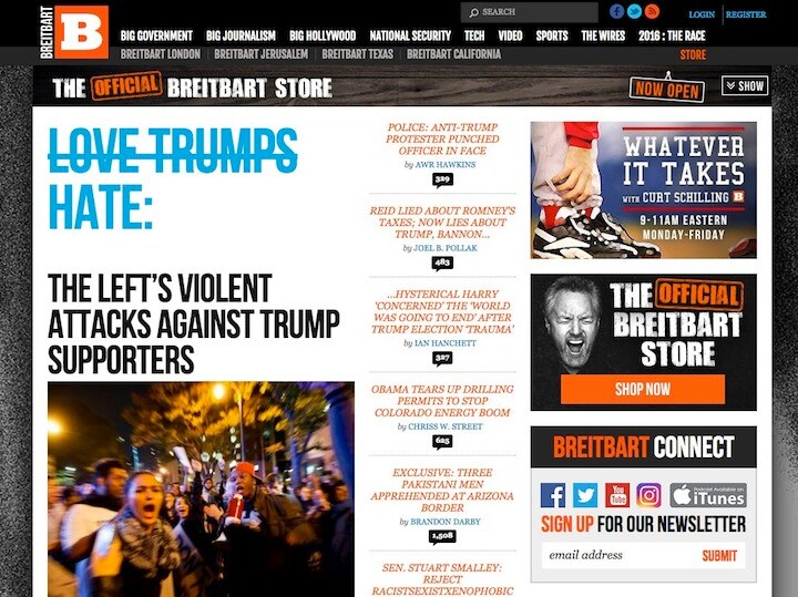 Breibartは過激な右派ニュースサイトなので、大統領選でもトランプ氏を応援していた。さらに今回の選挙では、Breibart Newsのスティーブン・バノン(Steven Bannon)会長が8月中旬にトランプ陣営の選挙対策本部最高責任者に任命されたこともあって、トランプ氏とBreibartの関係は密着していたと言える。Huffington Postの記事によるとバノン氏は「最も危険な政治フィクサー」と言われており、選挙対策の責任者に就いた彼はトランプ氏に過激な言動を再開させ、それが功を奏して勝利に至ったと見られている。