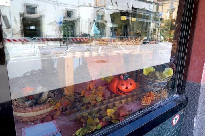 地震の翌年、2017年7月に、地震後初めてノルチャを訪ねたとき、思いがけずすでに開業している店があり、観光客も戻っていたので驚きました。けれども、町を取り巻く城壁の門の近くにある店には、10月30日の地震の際のものと思われるハロウィンの飾りつけがまだ残っていました。