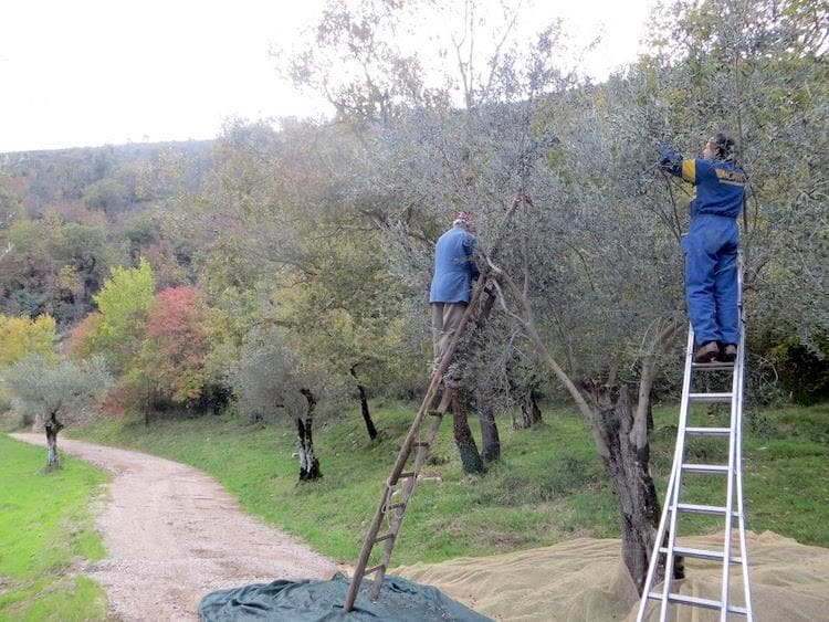 秋、オリーブ収穫の季節です。最近では、器械を使って収穫する家庭や業者も多いのですが、我が家では今も、義父が幼い頃からそうしていたように、手作業で収穫しています。まずは、木の周囲に大きな網を広げます。オリーブは、枝の上方を軽くげんこつでつかみ、そのままげんこつを枝にそって上から下に滑り下ろし、枝についた実を網の上に落としていきます。収穫しようと思う枝が高い位置にある場合には、写真のように、木にハシゴを立てかけ、ハシゴに登って収穫します。木のすべてのオリーブを取り終わったら、ハシゴを取り除き、四方の網を持ち上げて、網の上に落ちたたくさんの実を中央に寄せ、そうして一か所に集まった実を、そのままカゴに移していきます。(写真はこちらの記事)
