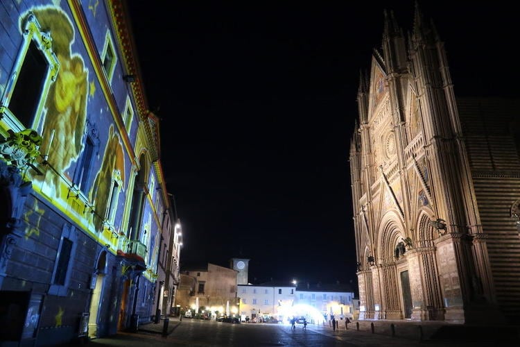 オルヴィエートの大聖堂が建つ広場には、芸術作品や古代エトルリア文明の遺跡が見られる美術館や博物館が並んでいるのですが、今年は新型コロナウイルス感染対策の規制のため、博物館も、展覧会や映画館と同様に、1月15日まで閉館で、また、レストランも、午後6時には閉店となっています。そのためでしょうか、大聖堂正面の建物の壁には、夜空で音楽を奏でる天使が映し出され、広場では大きな彗星が輝いて、道をゆく人々が、クリスマスの美しい飾りや心に、屋外を歩きながら触れることができるよう、工夫されていました。