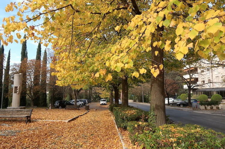紅葉狩りという言葉こそありませんが、イタリアでも野山や庭園、町の並木の黄葉や紅葉が美しい季節になりました。最近では、日本風の鮮やかに赤いもみじも、イタリアの街路樹や庭園で見かけるようになりましたが、今、ペルージャや出かけた先の町を歩いて、その美しさに打たれるのは、何と言っても菩提樹の黄葉です。ハートの形をした金色の葉が日の光に輝き、また、道や公園に敷きつめる落ち葉のじゅうたんも美しく、うっとりしながら、黄葉の中を歩いて、通勤しています。