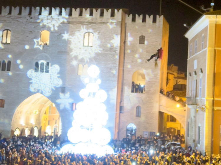 1月6日は同時に、ベファーナおばあさんがホウキに乗って空を飛び、子供たちの家を訪ねては、子供たちがいい子にしていれば、お菓子を贈り、悪い子であれば、木炭をつめていくという日であり、そのお菓子いっぱいの靴下を、子供たちが楽しみにしている日でもあります。様々な形でベファーナ祭りを催す市町村もあり、マルケ州のファブリアーノには、空飛ぶベファーナという祭りがあり、2018年には美しい光に彩られた中心街の広場に大勢が集まって、高い塔から広場の反対側まで張った綱を伝って降りていくベファーナを、皆が一心に見守っていました。