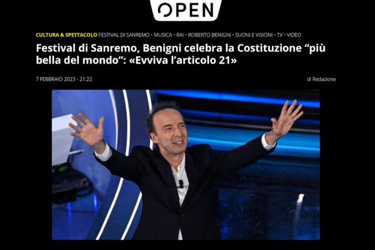 今年は2月初めに開催されたイタリアの歌の祭典、サンレモ音楽祭で、わたしの心に一番残ったのは歌ではなく、初日の最初のゲストだったロベルト・ベニーニが、イタリア共和国憲法について熱く語った言葉でした。イタリア憲法の施行から75周年という記念の年で、サンレモ音楽祭に初めて大統領が出席し、司会のあいさつのあとにすぐベニーニが憲法を語ったのですが、まずは皆を笑いの渦に巻き込んでから、憲法が起草されたときの様子やその精神、主要な条文を説き、聴衆を話に引き込んで感動させるその語りに、感嘆しました。