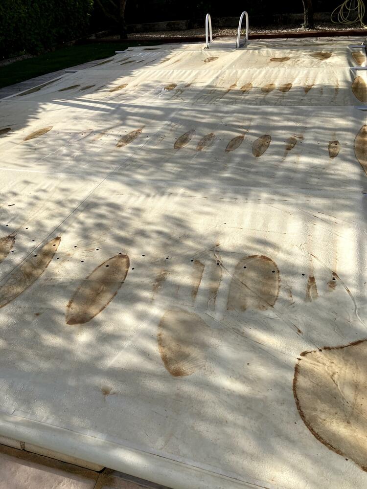 「え、何があったの???」と思って近づいてみた所、夜露に濡れたボディの一面に赤い砂塵が付着していました。不思議に思ってその日は終わったのですが、翌日はなんと庭一面が赤い砂塵で覆われており、冒頭の写真のようにプールカバーの上にも赤い砂塵が積もっておりました。