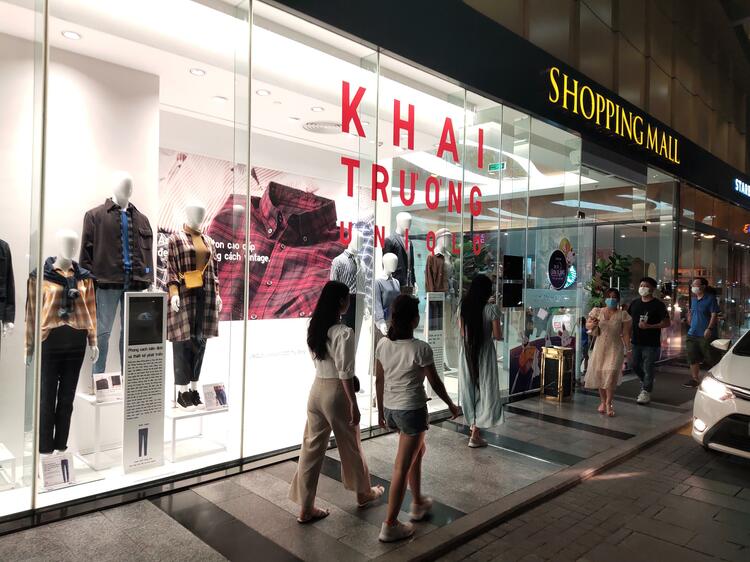 ユニクロ ビンコムメトロポリス店 ショッピングモールのお客さんはほとんどがマスク着用しています。 (筆者撮影)店員は全員マスクをしています。ショッピングモール・スーパーだけではなく、多くの人が集まる場所ではそうでしたが、社会隔離の時期はマスクをしなければ内に入れず、体温チェックと手の消毒も必ずしなければなりませんでした。