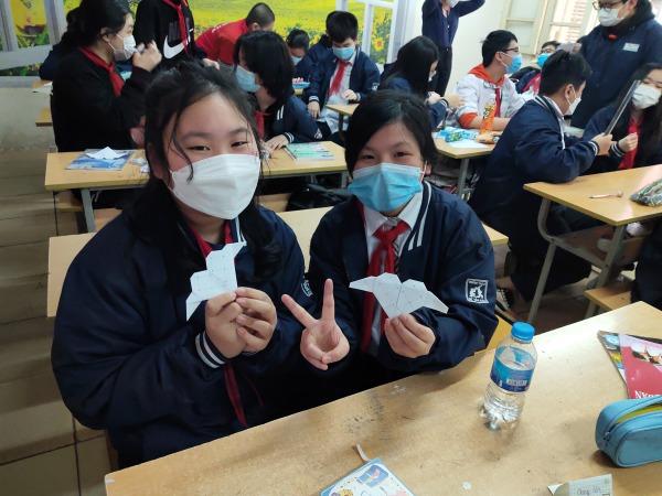ベトナムには折り紙に興味があり好きな子がとても多い。この日は授業中にオンラインと教室に学生の笑顔がこぼれていました。新型コロナ感染拡大が一日も早く収束する事を祈っています。