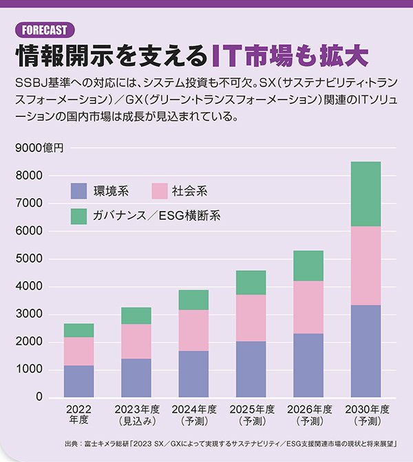 市場調査会社、富士キメラ総研によると、こうしたESG関連のITソリューション市場は2030年度には約8500億円と、22年度の3倍以上への拡大が予測されている。