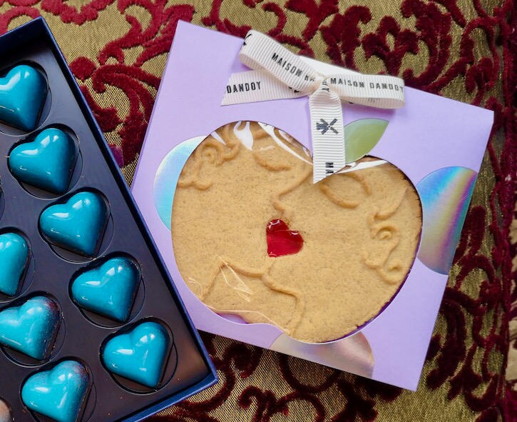 そして、バレンタインデー限定商品がご覧のビスキュイ(ビスケット)『Pomme d'amour ポム・ダムール(愛のリンゴ)』。左から Her & Her, Her & Him, Him & Him と3種類用意されています。男女の他に女性同士、男性同士がキスしている様子をモチーフにリンゴの形をしているビスキュイとなっています。キスをして唇が触れている部分にハート型❤️のジュレがあしらわれています。女性から男性へ、またその逆で、男性から女性へビスケットをプレゼントするのと同じように、女性から女性、男性から男性へも贈ってくださいね!という提案です。ちなみにヨーロッパでは女性から男性へチョコレートという日本と逆で、男性から女性へ花束やアクセサリーをプレゼントする習慣があります。現代ではお互いにプレゼントを交換したり、二人揃ってレストランで食事をする(今年はロックダウンで開いていませんが)のも一般的で、多くのレストランがバレンタインの特別メニューを提供します。