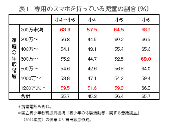 <表1>は、小学校4~6年生5000人ほどの調査データだ。一番下の合計欄を見ると、小4~6年生児童のスマホ所持率は55.7%と半数を超えている。家庭の年収別に見ると、最も高いのは年収200万未満の家庭の子で63.3%、その次が年収1200万以上の家庭(59.5%)となっている。