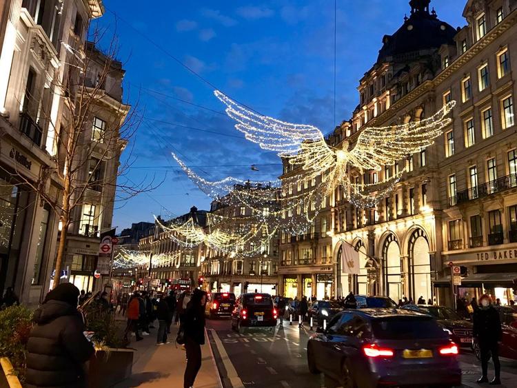(筆者撮影)上の写真は、オックスフォードサーカス付近。毎年飾られるイルミネーションは、例年より早く、二度めのロックダウンに入る前に点灯された。いつも楽しいモチーフも、今年は医療現場や配達などで働く人たちへの感謝と賛美のメッセージが横断幕に流れるというコロナ仕様だ。