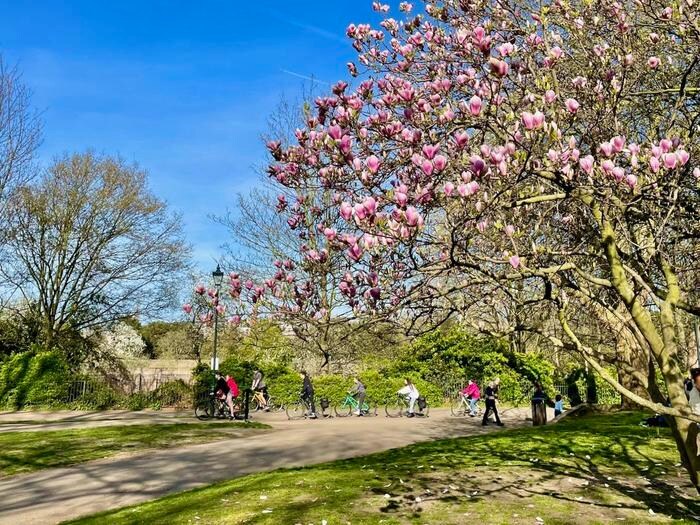 ピンクの木蓮や黄色のレンギョウが咲く公園を連れ立って歩く人、自転車で走る人、大きな木の下でお弁当を広げる人、走り回る子どもたち。わたしが住んでいるフラット(集合住宅)の共有の庭でも、高齢のご両親を訪ねてきたお子さん一家が芝生の上にピクニック用の毛布を敷いておしゃべりをしていた。足の悪いお父さんが腰掛けたベンチの周りには黄色いラッパ水仙が花盛りで、午後の太陽に明るく照らされていた。