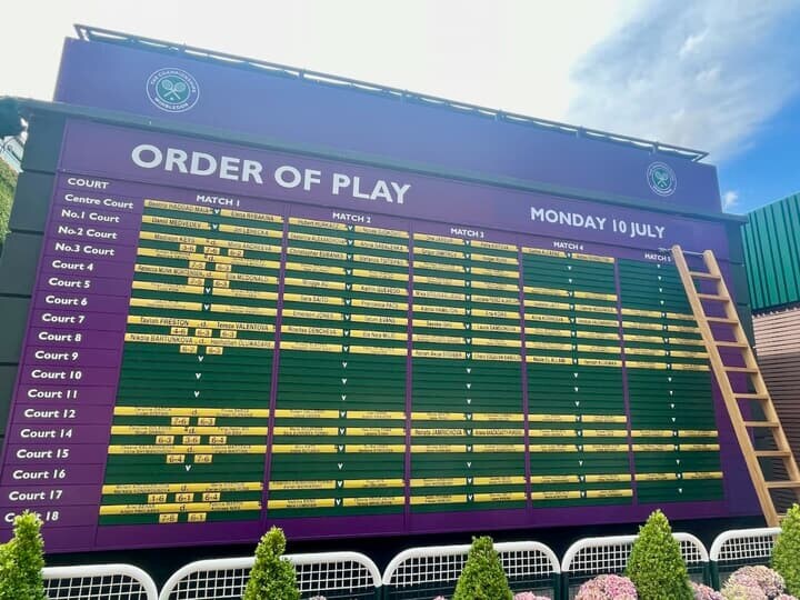 やってきました、センターコート。ローンテニス博物館のツアーで見学したことはあったけれど、満席の観客と一緒に試合を観るのはやはり感激だった。会場全体ではTシャツや短パン姿も多いのに、センターコートでは女性はサマードレスやワンピース、男性はシャツやジャケットという服装が目立つ。チケットの説明にも、「観戦にドレスコードはありませんが、大きなコートではドレスアップが好まれます」と書かれていた。