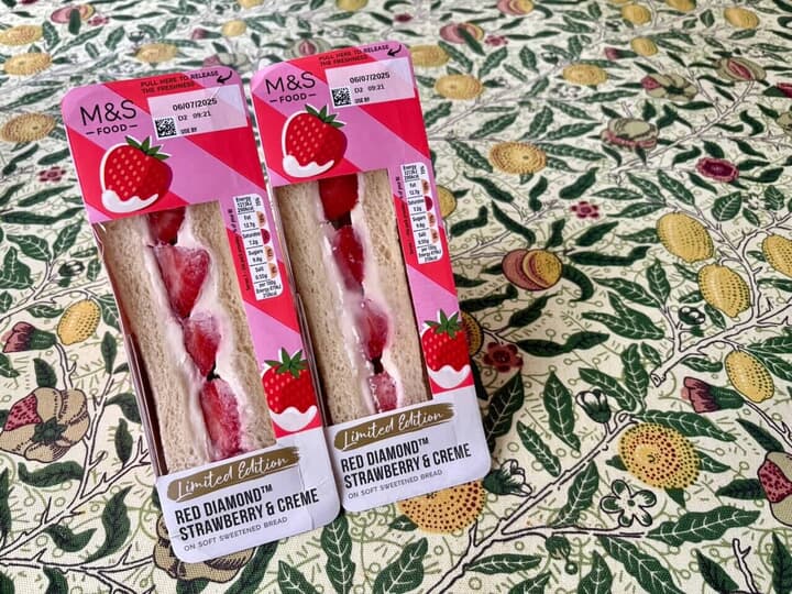 日本のフルーツサンドにヒントを得たこのいちごサンドは、わざわざ日本風に甘くやわらかめに作られたパンに、いちごと生クリームがはさまれている。発売2日後にはM&Sのサンドイッチ売り上げナンバーワンに輝いたほどの売れ行きで、2週間ほど過ぎてようやく落ち着き始め、今ではずいぶん手に入りやすくなった。わたしの周りでは、ここ数日でやっと食べたよという友人が増えている。