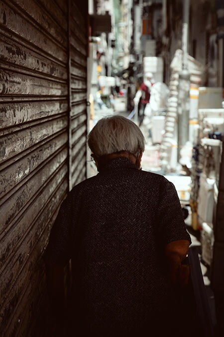 抜け道を歩いていく買い物客、清掃に励むおばさん