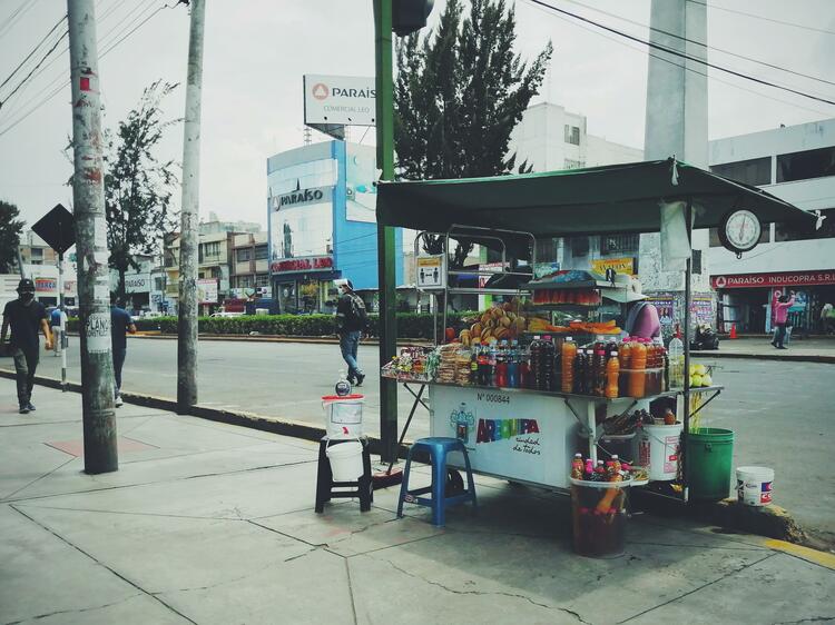 リマには便利なコンビニエンスストアもあるが、屋台の食べ物は新鮮で価格も手ごろのため人気がある。