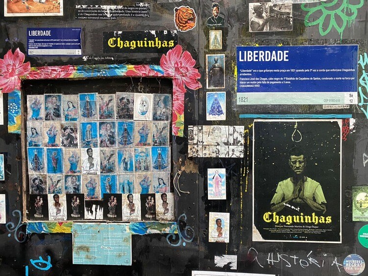 Achei interessante este grafite na Liberdade. Está escrito em japonês "Liberdade não é só Japão" com a imagem de Chaguinhas, um negro morto na forca no séc XIX. O bairro tinha presença marcante de negros e indígenas antes. O apagamento de memórias coletivas é política de Estado. pic.twitter.com/QUR2u1B6Tw