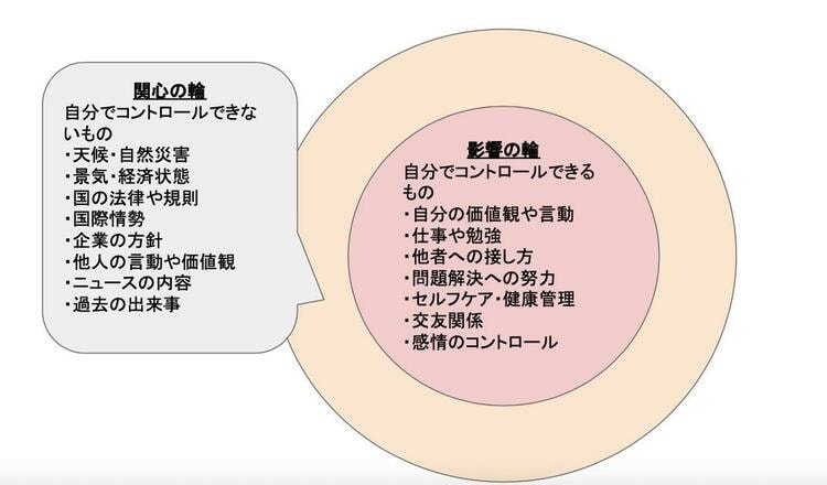 自分が関心を持っているものについては「関心の輪」と呼び、その中で自分がコントロールしたり変えることのできるものは「影響の輪」と呼んでいます。