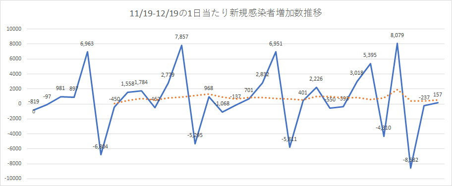 祭事シーズンに伴い、濃厚接触が増えて感染者数が爆増するのではないかという懸念もありましたが、11月19日から12月19日のデータを見てみると、そこまで爆増している傾向は見せてないです。