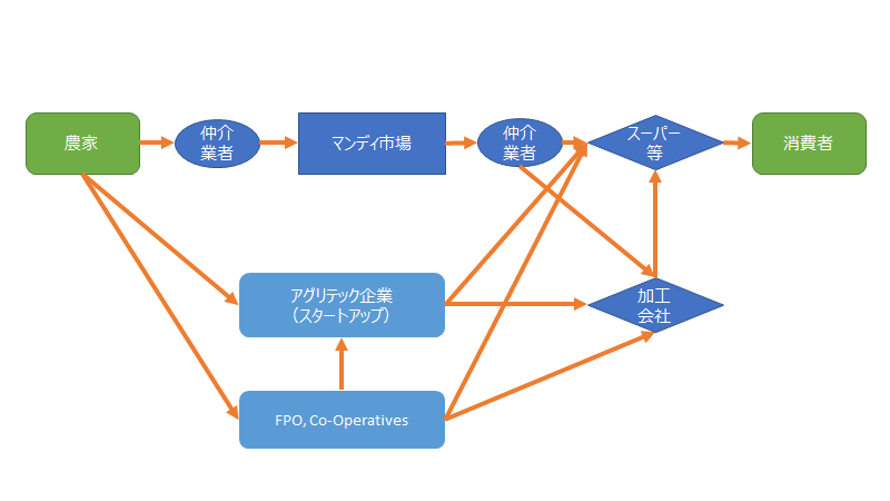 ■マンディ市場:ヒンディー語でマンディとは市場を意味します。マンディを経由して、農作物が消費者へ届くスキームというのが、インドの伝統的な農業サプライチェーンでした。多くの州では、農産物マーケティング委員会(Agricultural produce market committee,略称APMC)が農産物の卸売市場を運営してます。卸売市場は、穀物、豆類、野菜、ジャガイモやタマネギ、香辛料や調味料、果物など、扱う商品の種類に応じて分別されています。ただ、マンディを中心に多数の仲介業者が発生してしまい、農家から消費者までで仲介業者が増えすぎて搾取になっているという批判もありました。