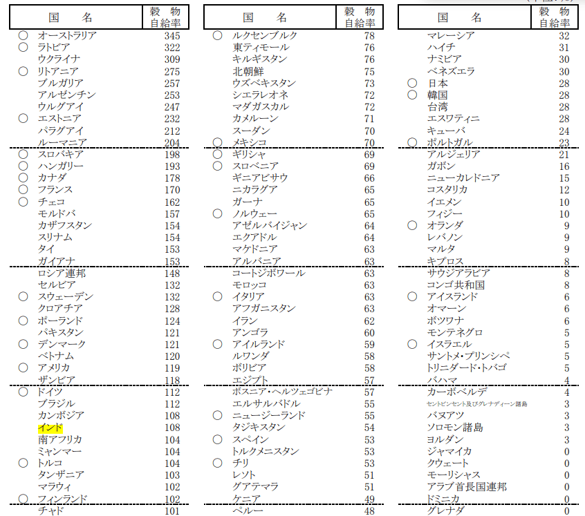 (農林水産省、世界の食料自給率データより引用、元データは2017年)