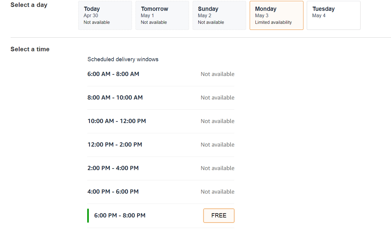 AMAZON Freshの生活必需品配送サービスもスロットはやや混んでいますが、「物はありません!」という状態ではないです。