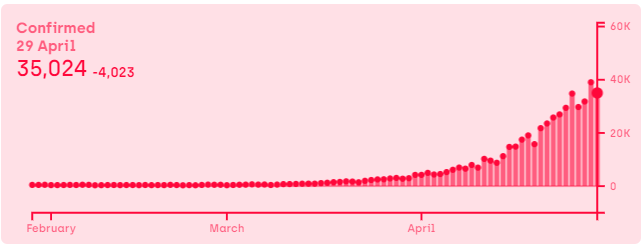 以下は日別の新規感染者数と累計死亡者数を出した棒グラフですが、4月に入って加速度的に増加していることが読み取れます。