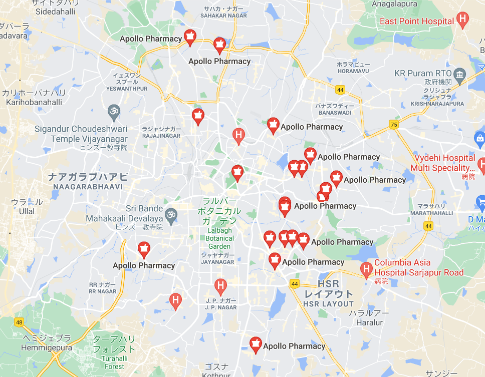 ベンガルールでの拠点数となりますが、Google Mapで見ただけでもかなりのショップ数を誇り、インド国内で数多くのショップを保有しています。