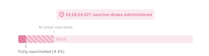 インド全土でのワクチン接種状況ですが、約3億人弱が1回目のワクチン接種を完了して、約5200万人が2回目のワクチンを接種した計算となります。