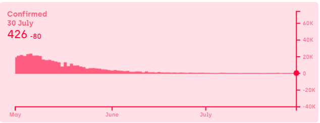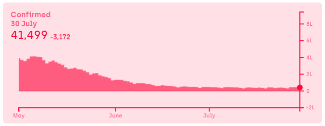 一回目のロックダウン(2020年3月~5月中頃)、二回目のロックダウン(4月末~6月中旬)と展開されてきましたが、感染者全体の増減幅を示した図は以下となります。