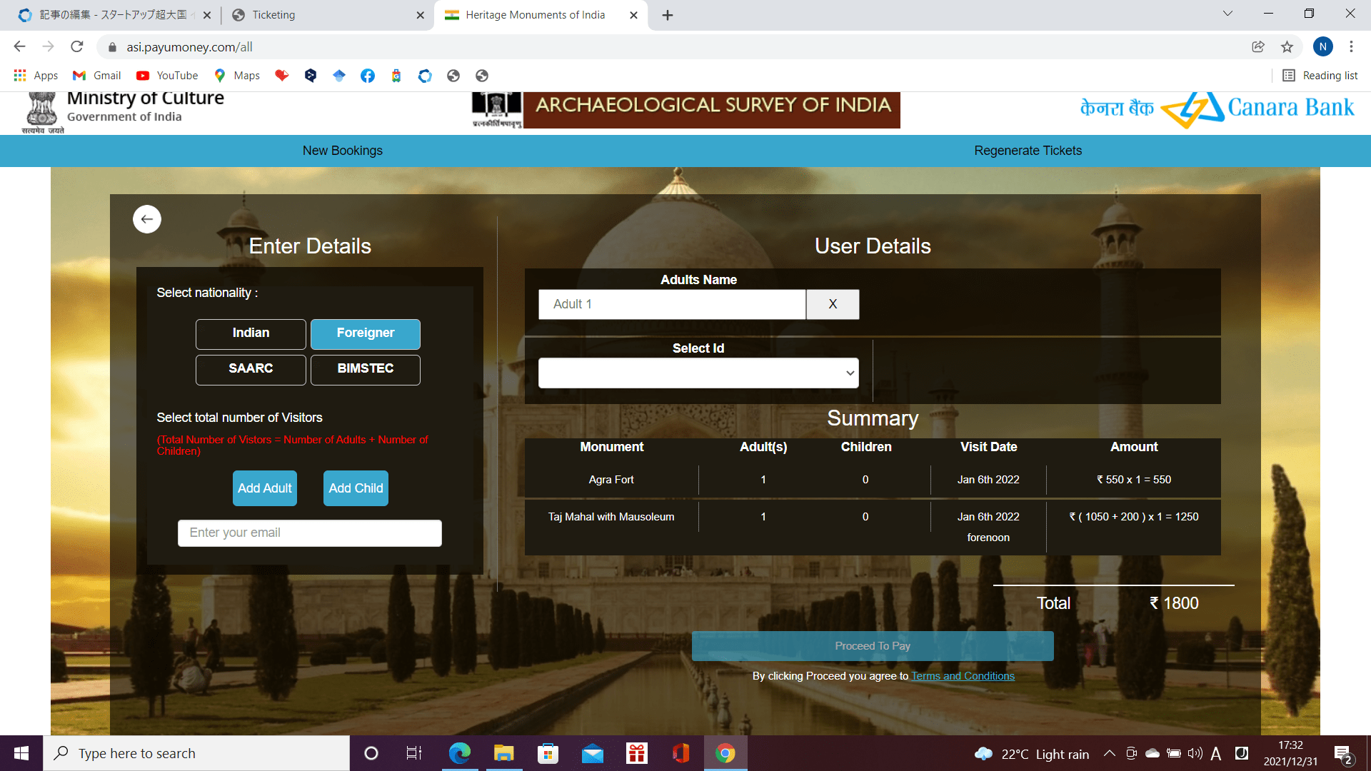 オンラインからのチケット購入はこちらからできます。一度の予約でタージマハル、アグラフォートまとめて購入できるので便利です。