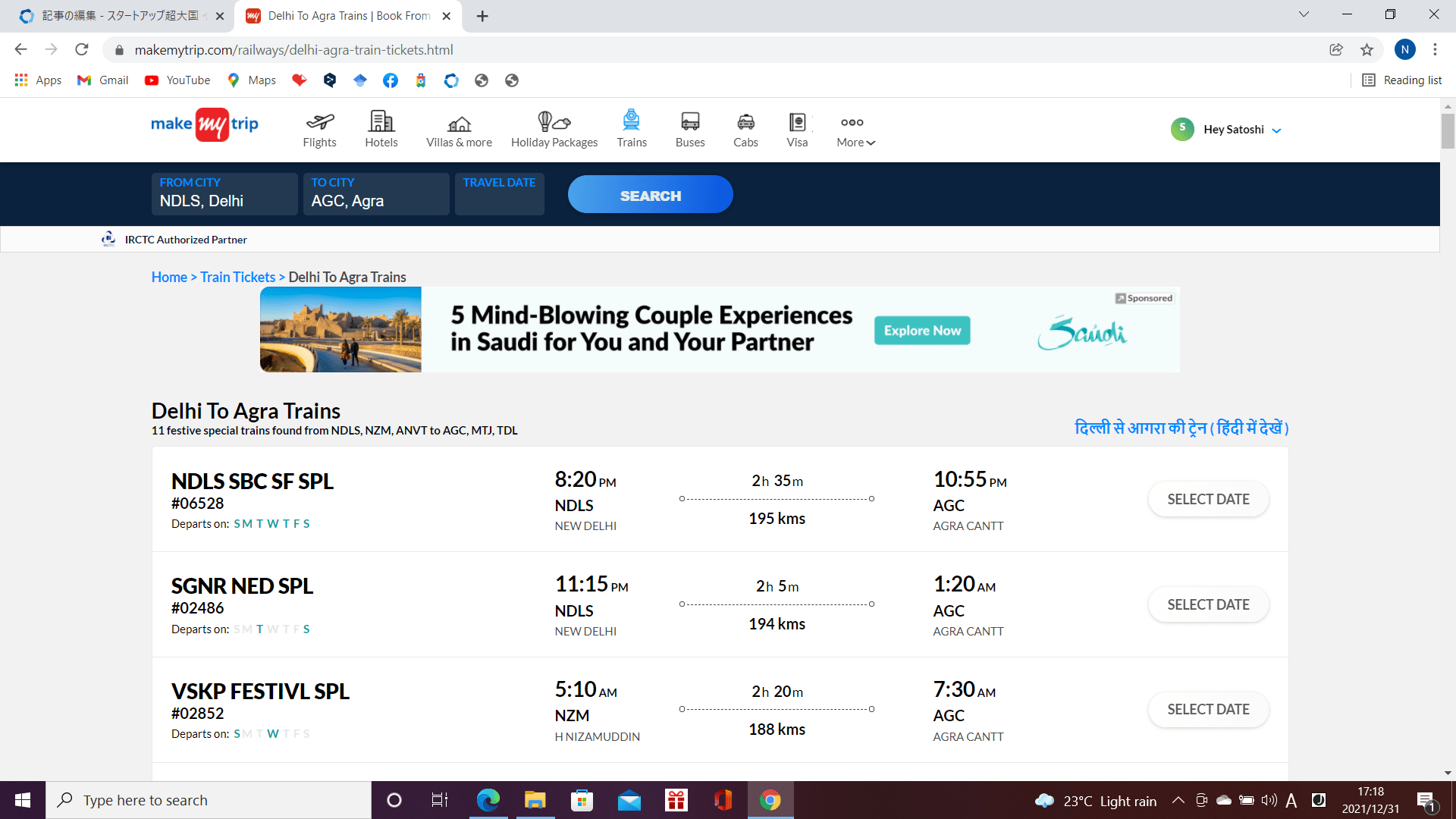 電車については、こちらのMakemytripの旅券販売サイトで買うことができるので、グレードの高いチケットを買えば行けるはずです。