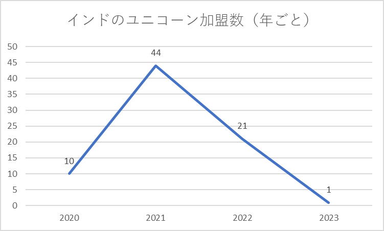 それでは、統計で見て、エコシステムがどうなっているか見てみましょう。まずはユニコーン数ですが、Venture intelligenceによれば、2023年もそろそろ終わってしまいますが、インドでは、まだ1件のスタートアップしかユニコーンクラブ入りしていないです。
