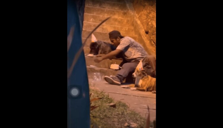 ホームレス男性が道端で飼い犬の誕生日を祝う