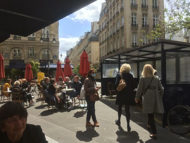これってテラス??と思うようなテラス席 筆者撮影地域によっては、お店の前のテラス席だけではなく、通路全体がテラスになっていたり、道の反対側までがテラス席になっていたりして、結果的には、店内のスペースよりも客席が確保できているのではないか?と思われるレストランも多く、これまたテラス好きのフランス人のこと、ここぞとばかりに新しいテラス空間を楽しんでいます。まるで水を得た魚のように夢中でおしゃべりをしながら、食事を楽しむ人々の光景に、「あ〜これがパリだ!日常が戻ってきた!」と、どこかほっこりするのと同時に「フランス人には、黙食はあり得ない!」とあらためて思わされたのでした。フランス人にとっての外食は、食べることと同じくらいに「喋ること」なのです。