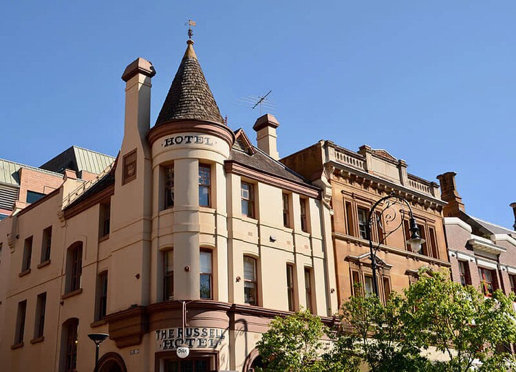 ラッセル・ホテルは、1887年に建てられた歴史的建造物をそのまま利用したこぢんまりとしたプチホテルで、シドニーの歴史地区でもあるザ・ロックスの目抜き通りに、その長い歴史を物語るべく、佇んでいる。