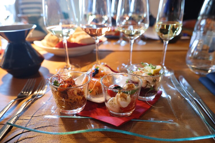 次に向かったのはクライヒガウ地域ブルッフザールのワイナリー・クルンプ。ワインに合う簡単かつクリエイティブなおつまみ(アンティパスタ、タパスなど)と共にワイン試飲のワークショップに参加しました。